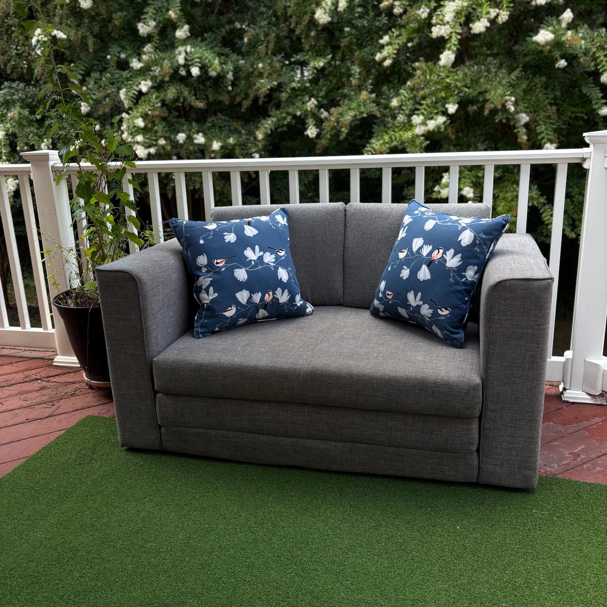 A blue pillow with delicate white flowers and small colorful birds perched on branches; soft, charming, and perfect for cozy decor.