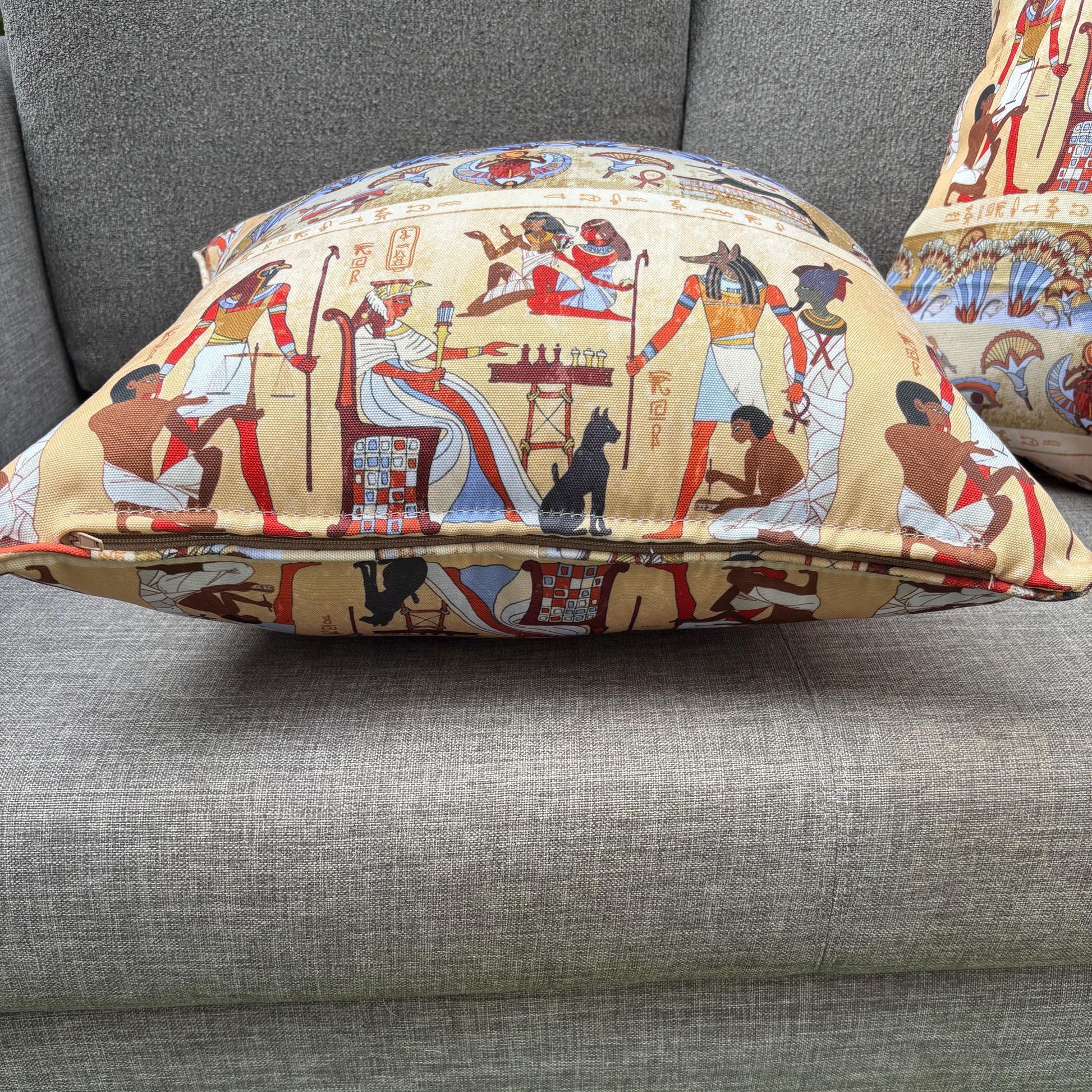 The pillow features colorful Egyptian-inspired designs with gods, hieroglyphs, lotus flowers, and symbolic imagery on a soft, decorative fabric.