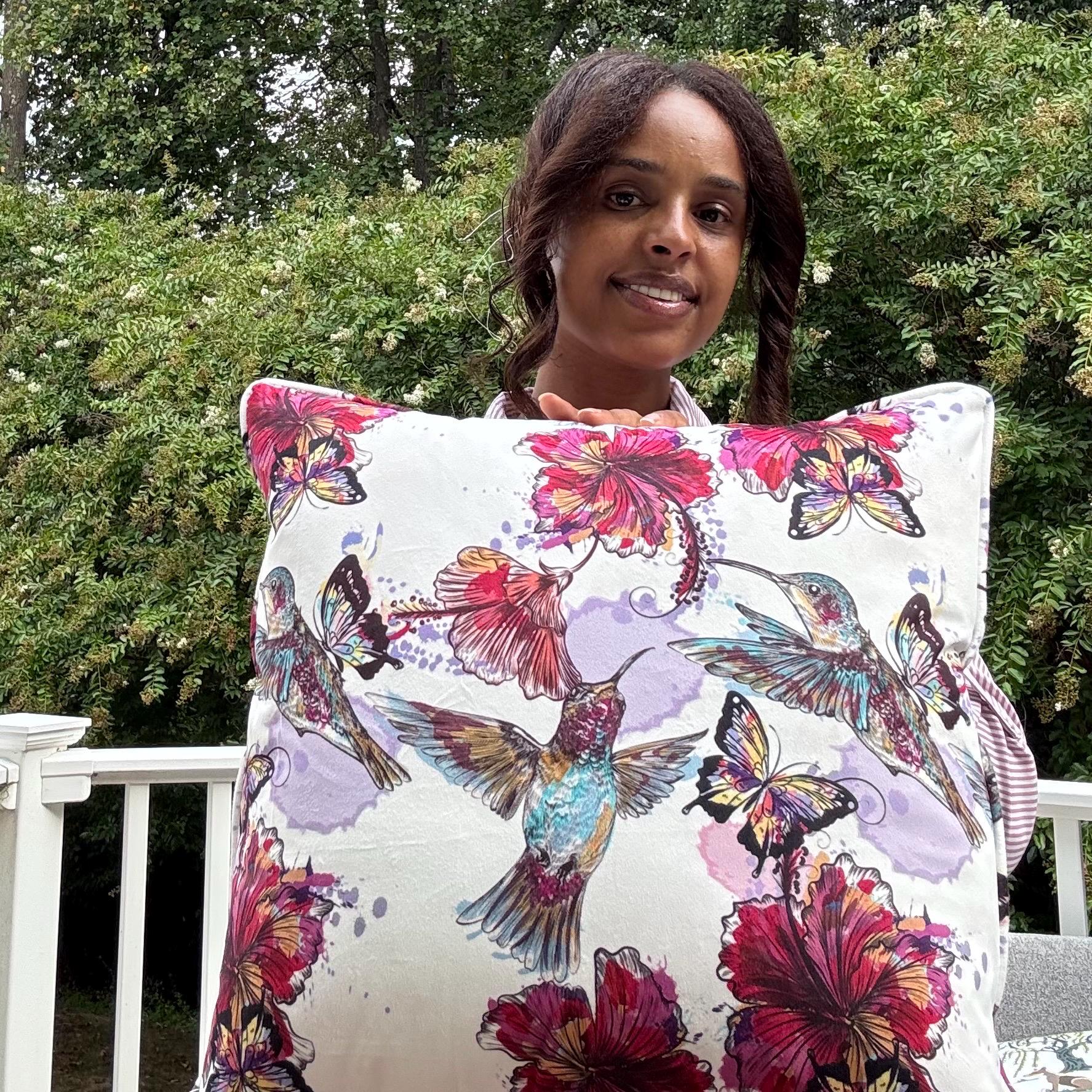 A vibrant pillow featuring colorful hummingbirds, butterflies, and bold red flowers with artistic watercolor splashes on a soft white background.