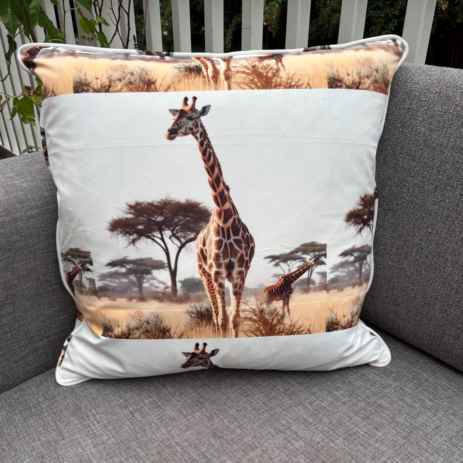 This pillow features a majestic giraffe design with an African savanna background, blending nature’s beauty and comfort for stylish home décor.