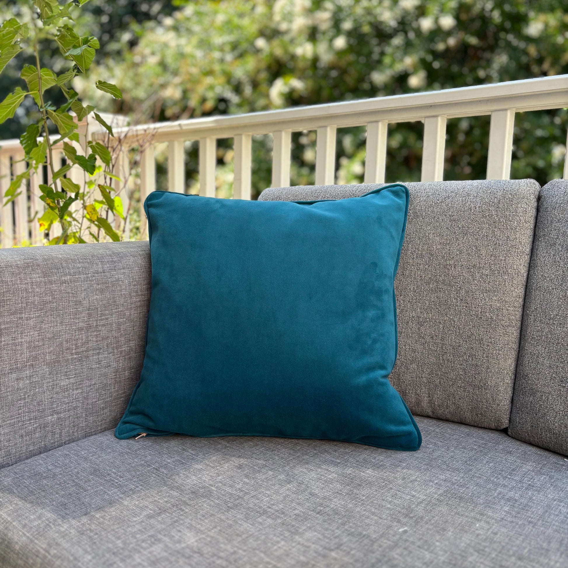 This luxurious, deep teal velvet pillow offers a soft, inviting embrace, adding a serene and sophisticated pop of color to any space.